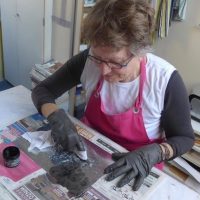 Etsen kan ik thuis omdat ik een pers heb, maar zeefdrukken helaas niet. Ondertussen ben ik met de etsclub een weekje gaan etsen in het Pieter Boreel centrum in België. Hier heb ik ook een dag kunnen steendrukken. Dit was: steen uitzoeken, klaar maken, drukken, schoonmaken. In het Steendruk museum in Valkenswaard heb ik een dag een workshop gedaan. Hier was de steen al voorbereid. Na het drukken hoefde de steen ook niet worden schoongemaakt. Het was beiden een bijzondere ervaring. Weer een totaal ander druktechniek.
